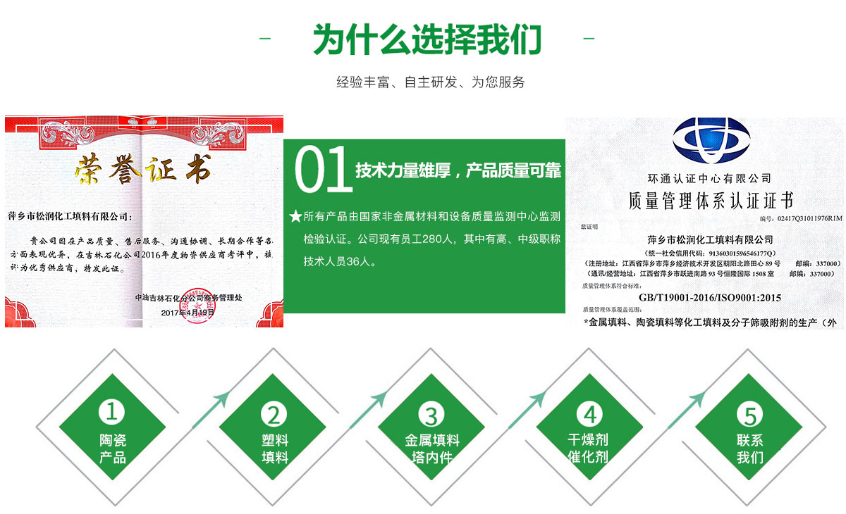 萍鄉(xiāng)市松潤(rùn)化工填料有限公司位于江西省萍鄉(xiāng)市國(guó)家經(jīng)濟(jì)開(kāi)發(fā)區(qū)西區(qū),是專(zhuān)業(yè)生產(chǎn)、經(jīng)營(yíng)陶瓷、聚丙烯、金屬填料、塔內(nèi)件、水處理濾板、濾管、濾料、瓷球、分子篩、催化劑、活性炭、蜂窩陶瓷、瓷質(zhì)耐磨托輥等系列產(chǎn)品的民營(yíng)企業(yè)。所有產(chǎn)品由國(guó)家非金屬材料和設(shè)備質(zhì)量監(jiān)測(cè)中心監(jiān)測(cè)檢驗(yàn)認(rèn)證。公司現(xiàn)有員工280人,其中有高、中級(jí)職稱(chēng)技術(shù)人員36人。工藝先進(jìn),技術(shù)力量雄厚,產(chǎn)品質(zhì)量可靠,配...